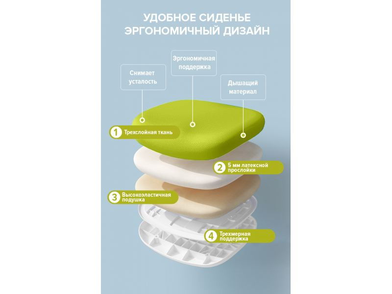 Материал обивки - ткань, которую можно легко снять и почистить. Набивка кресла выполнена из вспененного полиуретана плотностью 22-25 кг/м3, что обеспечивает мягкость и удобство при сидении. Максимальная нагрузка на кресло до 120 килограмм, что позволяет детям комфортно сидеть в нем.