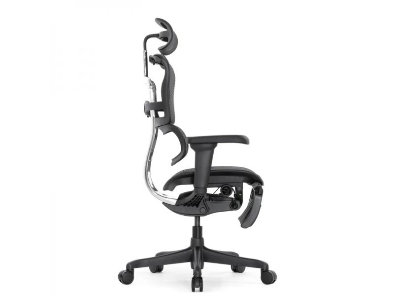 Кресло оснащено спинкой с гибкой поясничной опорой 6D, которая регулируется по натяжению и высоте, поддерживая правильное положение позвоночника. 2D подголовник легко настраивается по высоте и углу наклона, чтобы снять напряжение с шеи и верхней части спины.