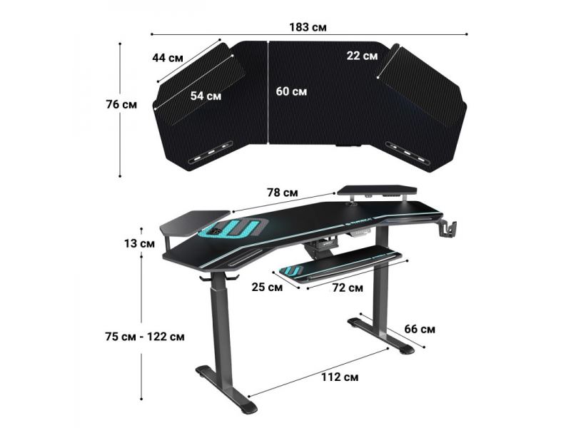 Eureka ERK-ES71-B-EU cтол для геймеров со светодиодной подсветкой, большой крышкой шириной 183 см в форме крыла, с полкой для клавиатуры, подставкой под монитор, двойным держателем наушников, подстаканником для трансляций, стримов