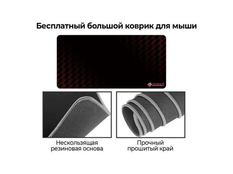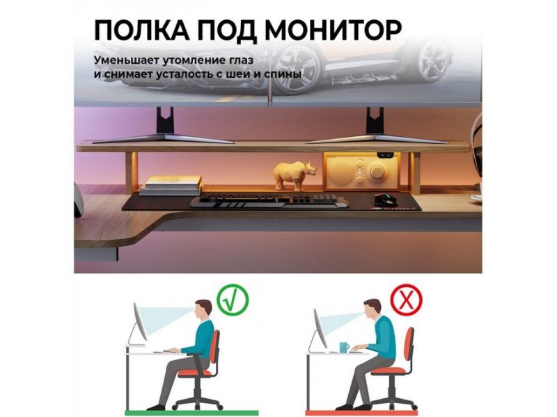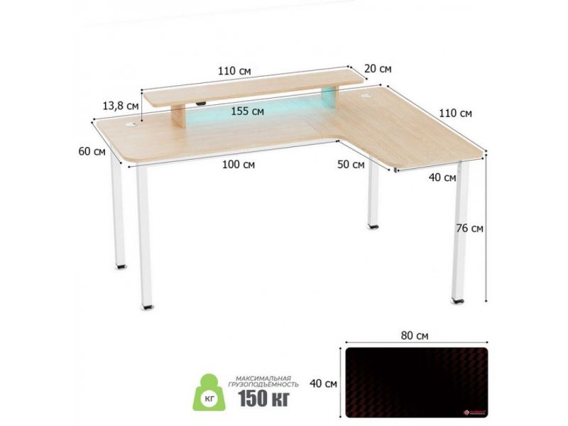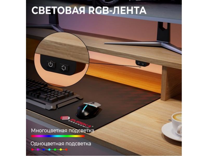 - Оснащён полкой под монитор с управляемой RGB-подсветкой и ковриком для мыши
